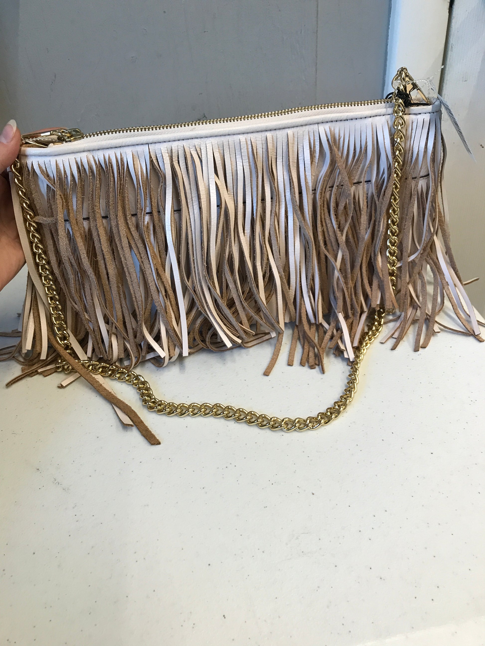 Clutch Designer By Rebecca Minkoff In Tan & White, Size:Medium