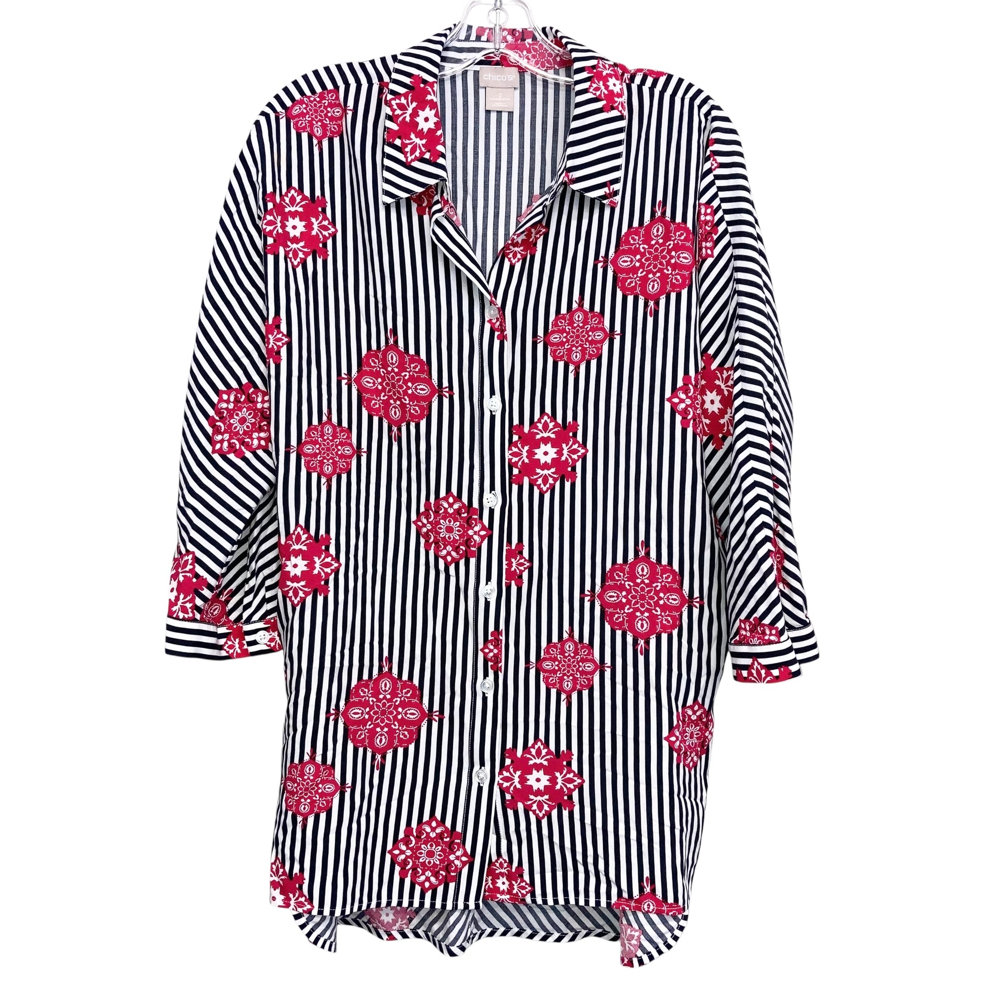 Vibrant black and red Chicos top, size L, with stylish 3/4 sleeves. Chic, bold, and versatile.