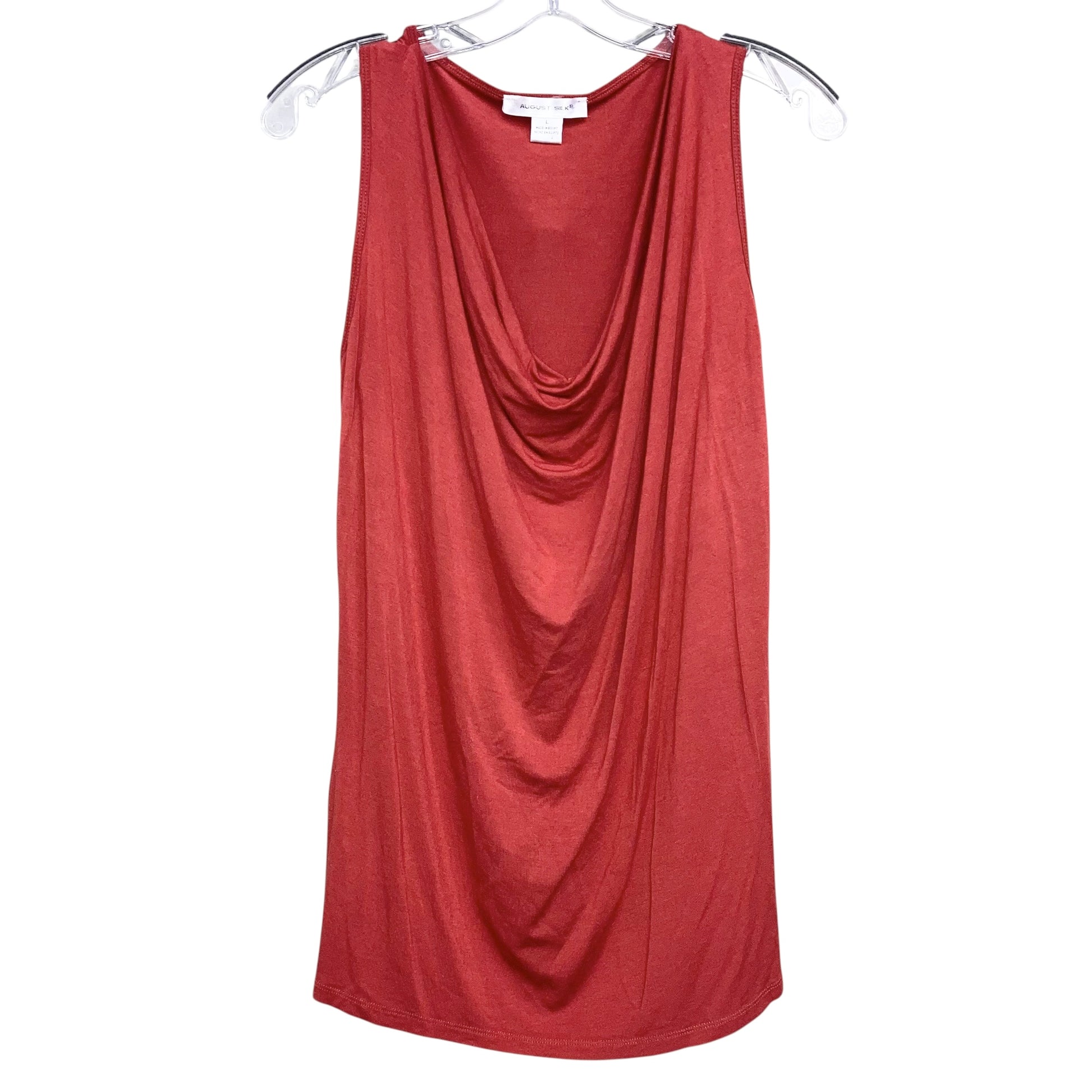 Effortlessly chic in vibrant orange, this August Silk top in size L exudes sophistication. The sleeveless design offers comfort and style for any occasion.